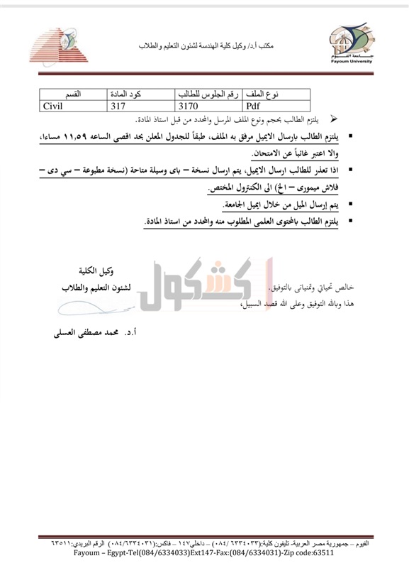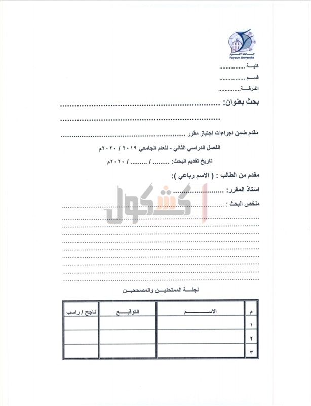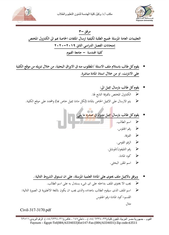 جامعات التعليمات العامة لطلبة هندسة الفيوم بشأن الأبحاث العلمية إسراء جمال الخميس 14/مايو/2020 - 06:26 م 5/14/2020 6:26:00 PM طباعة أعلنت كلية الهندسة بجامعة الفيوم التعليمات العامة لمشاريع الأبحاث المطلوبة من طلاب النقل وهي كما موضح بالصور facebook twitter whats شارك
