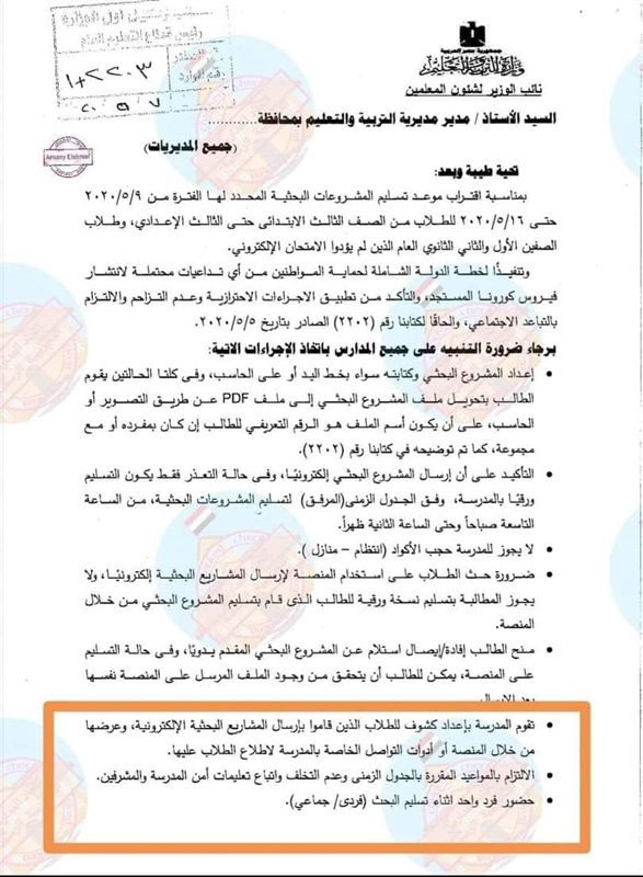 أكد الدكتور طارق شوقي وزير التربية والتعليم والتعليم الفني، على ضرورة قيام المدارس، بتعليق كشوفات بأسماء الطلاب في مكان ظاهر للجميع داخل المدرسة، وعلى صفحه المدرسة بوسائل التواصل الاجتماعي وعبر منصة إدمودو، بالثلاث وسائل وليس وسيلة واحدة فقط، للطلبة الذين قاموا بتسليم البحث الكتروني.