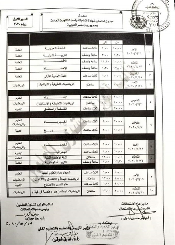 ووقع علي الجدول المنشور الدكتور رضا حجازي نائب وزير التربية والتعليم لشئون المعلمين, والدكتور ياسر حسين بدوى مدير عام الامتحانات.