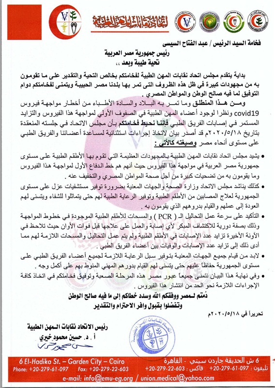 لذا خاطب مجلس اتحاد المهن الطبية عبد الفتاح السيسي رئيس الجمهورية، وكذلك رئيس الوزراء دكتور مصطفى مدبولي، ورئيس مجلس النواب، د على عبد العال وكذلك وزارة الصحة، وكل الجهات المعنية، بضرورة توفير مستشفيات عزل على مستوى الجمهورية لعلاج المصابين من الأطقم الطبية وتوفير الرعاية الطبية لهم حتى يتماثلوا للشفاء، ويتسنى لهم العودة إلى عملهم والقيام بدورهم، الذي يقومون به.