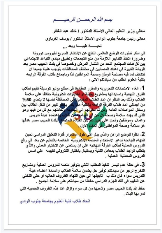 أصدر اتحاد طلاب كلية العلوم في جامعة جنوب الوادي، بيانًا لمطالبة وزارة التعليم العالي والبحث العلمي بإلغاء الامتحانات النهائية واستبدالها بالبحث الإلكتروني أسوة بزملائهم في سنوات النقل.