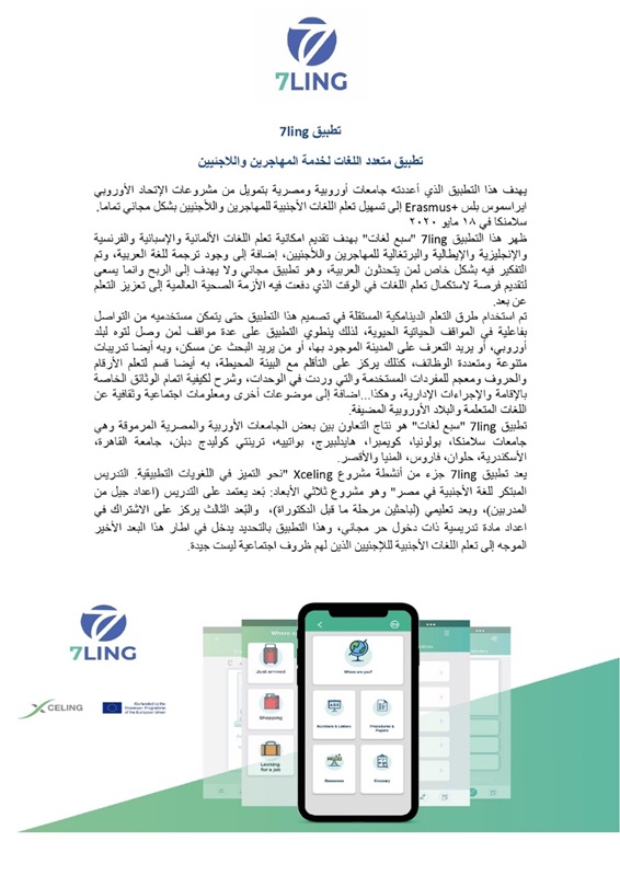 أطلق تطبيق 7ling متعدد اللغات لخدمة المهاجرين واللاجئيين، الذي أعددته جامعات أوروبية ومصرية بتمويل من مشروعات الإتحاد الأوروبي ايراسموس بلس Erasmus+، حيث يهدف هذا التطبيق إلى تسهيل تعلم اللغات الأجنبية للمهاجرين واللاجئين بشكل مجاني تماما.