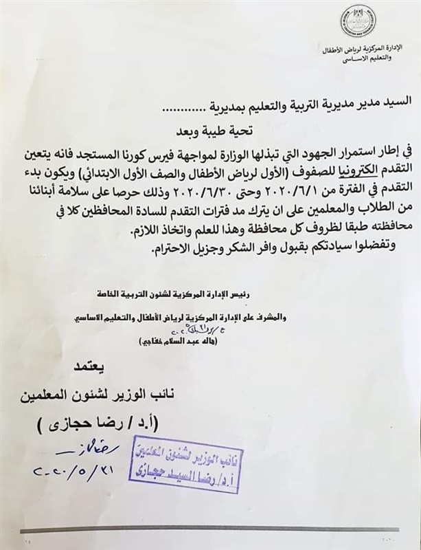 جاء ذلك خلال خطاب رسمي وقع عليه الدكتور رضا حجازي نائب وزير التربية والتعليم لشئون المعلمين, وتم تعميمه علي المديريات التعليمية بجمهورية مصر العربية.