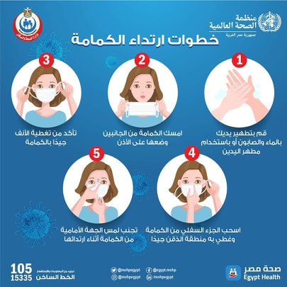 نشرت وزارة الصحة والسكان خطوات ارتداء الكمامة بشكل صحيح لحماية الأشخاص لتجنب انتقال العدوي لهم وللأخرين أيضاً، وجاءت كالتالي: