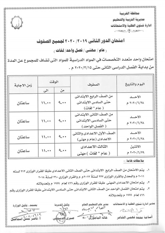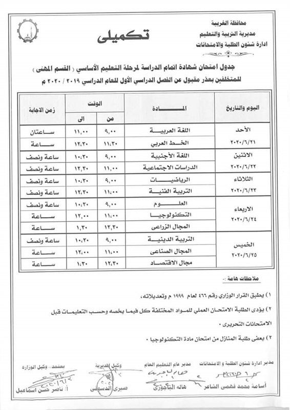 ننشر جدول الامتحانات التكميلية لصفوف النقل والإعدادية في الغربية