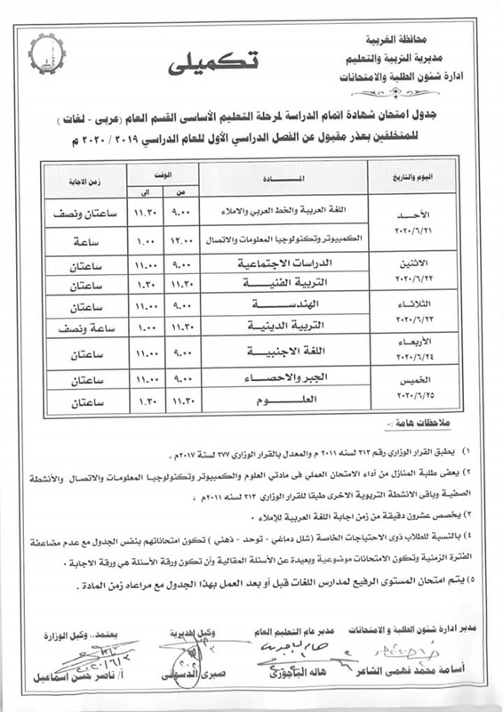 أعلنت مديرية التربية والتعليم في الغربية جدول امتحان التكلميلى والدور الثانى للشهادة الإعدادية (عام - مهنى ) للعام الدراسي2019/2020, للطلاب الذين رسبوا في امتحانات الشهادة الإعدادية او لم يسلموا المشروعات البحثية المطلوبة.