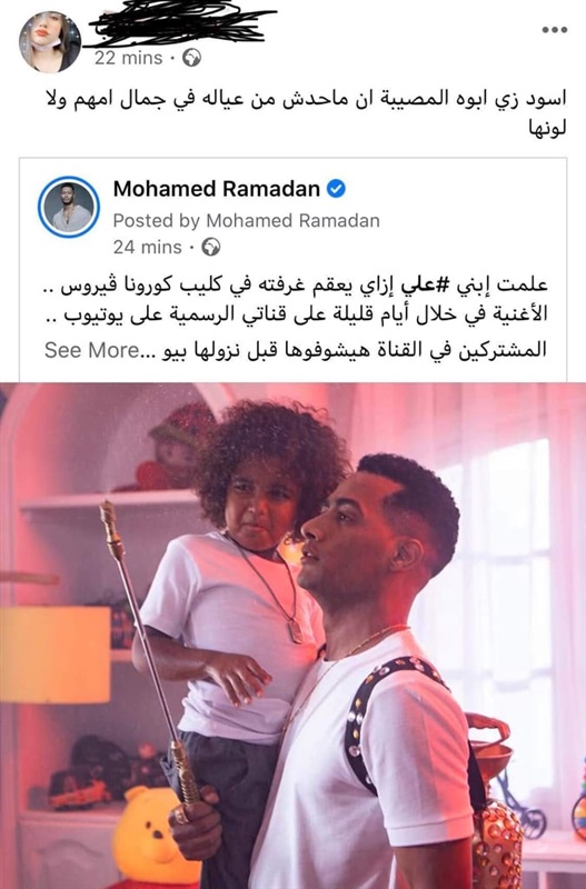 وكتب محمد رمضان عبر صفحته الشخصية على إحدى مواقع التواصل الاجتماعي" الفيس برك":" انا فخور بلوني ولون ابويا واولادي .. اللي ربنا خلقه ومبسوط ان ولادي هيطلعوا ضد العنصرية والدليل ان امهم وأبوهم لونين مختلفين عن بعض".