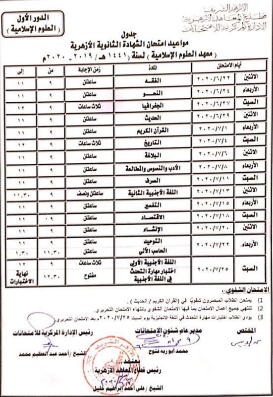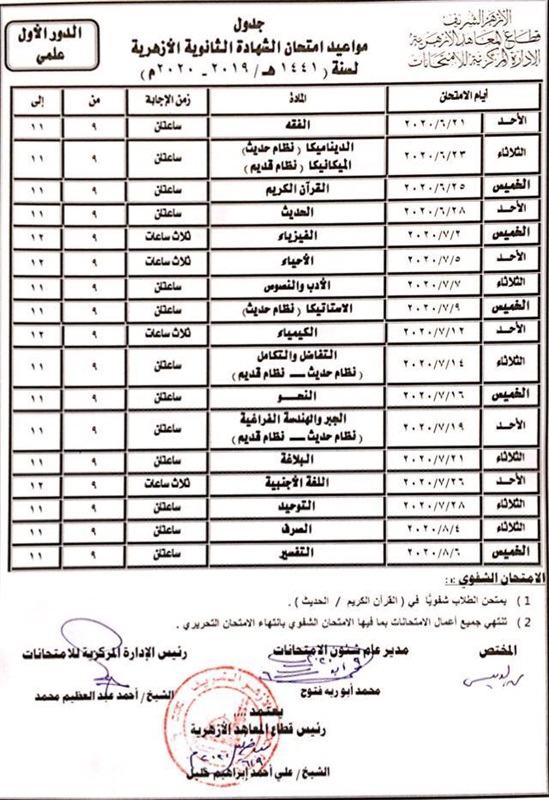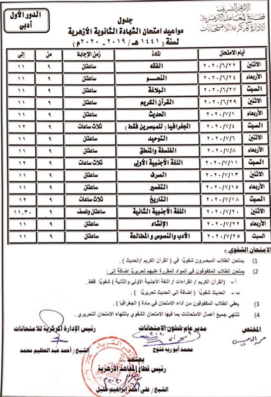 اعتمد الشيخ صالح عباس، وكيل الأزهر الشريف، صباح اليوم، جدول مواعيد امتحان الشهادة الثانوية الأزهرية لسنة (٢٠١٩ - ٢٠٢٠) بأقسامها العلمية والأدبية والعلوم الإسلامية.
