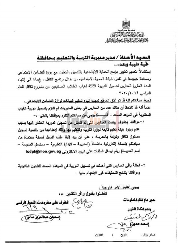 جاء ذلك خلال خطاب رسمي عممته وزارة التربية والتعليم والتعليم الفني، على المديريات التعليمية بشأن برامج التضامن الاجتماعي.