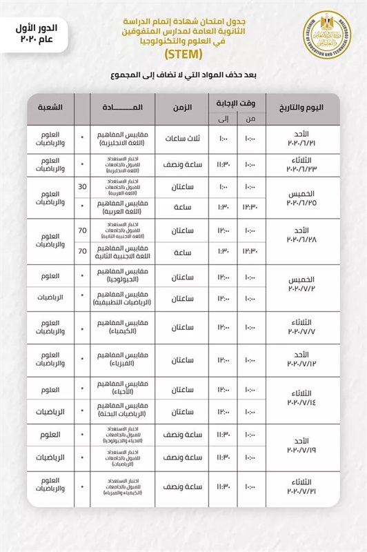 نشرت الصفحة الرسمية لوزارة التربية والتعليم علي موقع التواصل الاجتماعي فيسبوك، جدول امتحانات الدور الأول لشهادة إتمام الدراسة الثانوية العامة لمدارس المتفوقين فى العلوم والتكنولوجيا (STEM) للعام الدراسي ٢٠١٩-٢٠٢٠ بعد حذف المواد التي لا تضاف إلى المجموع التي سيتم آدائها من المنزل.