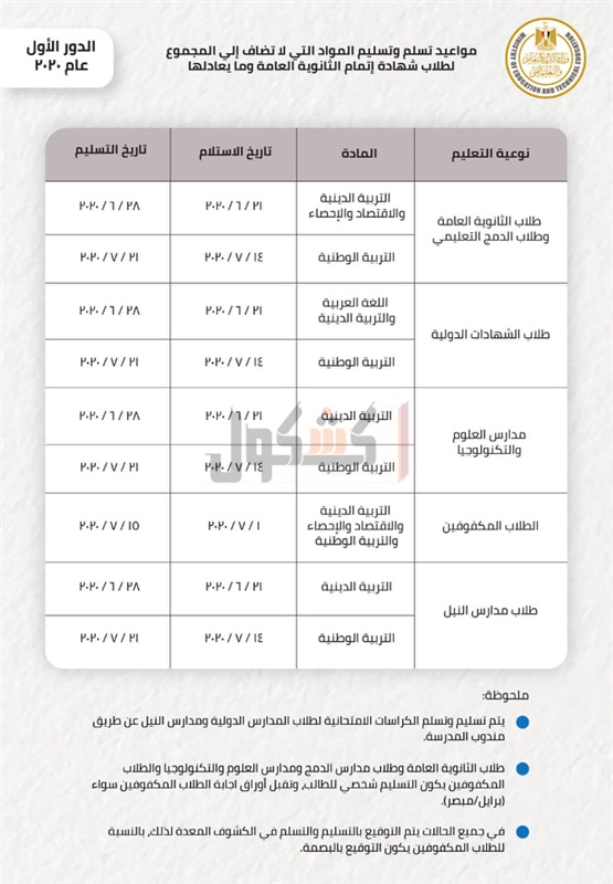 إعلان مواعيد استلام وتسليم المواد الغير مضافة للمجموع بالثانوية العامة