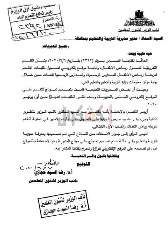 حسمت وزارة التربية والتعليم والتعليم الفني، الجدل بشأن التقديم إلكترونيا لفصول رياض الأطفال، وأصدرت خطاب الحاقا بكتابها رقم 2392 بتاريخ 9 يونيو، بإتاحة موقع إلكتروني لتسجيل طلبات التقدم لمرحلة رياض الأطفال المدارس الرسمية من خلال بوابة مركز معلومات وزارة التربية والتعليم.