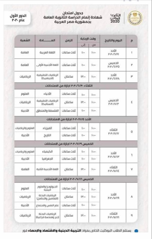 جدول امتحانات الصف الثالث الثانوي 2020 بعد التعديل
