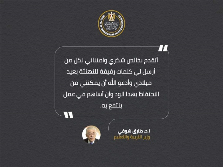 تقدم الدكتور طارق شوقي وزير التربية والتعليم والتعليم الفني، بخالص الشكر والإمتنان لكل من هنأه بعيد ميلاده.