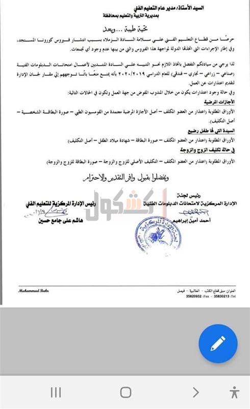 حظر قطاع التعليم الفني في وزارة التربية والتعليم، على المعلمين المنتدبين لأعمال المراقبة والتصحيح في امتحانات الدبلومات الفنية للعام الدراسي ٢٠١٩ / ٢٠٢٠، التوجه للجان الإدارة لتقديم اعتذاراتهم عن العمل.