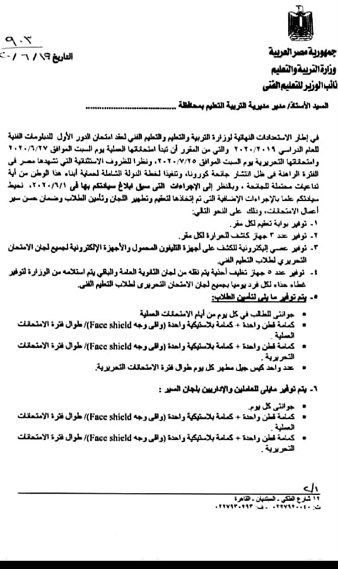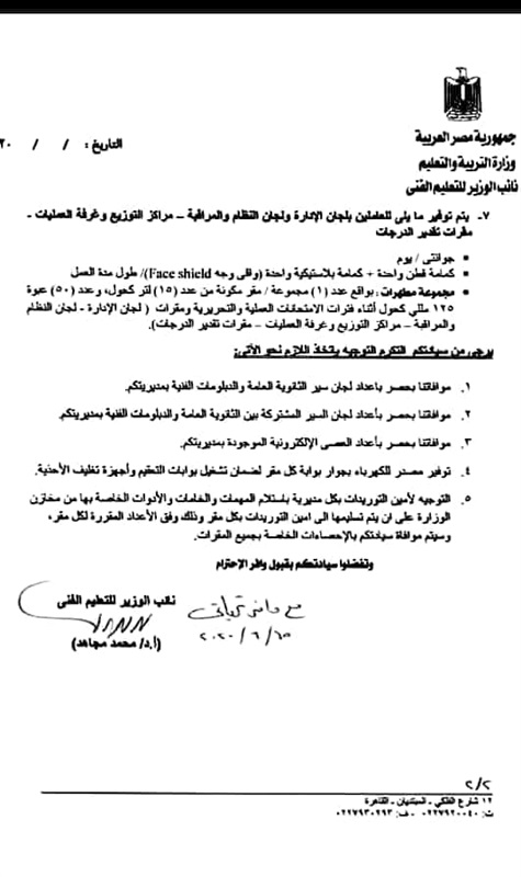 وأشار إلى أنه بالنسبة للعاملين بلجان الادارة ولجان النظام والمراقبة ومراكز توزيع الاسئلة وغرفة العمليات، ومقرات تقدير الدرجات يتم توفير جوانتي كل يوم وكمامة قطن واحدة وواقي وجه طوال مدة العمل ، ومجموعة مطهرات بواقع 1 مجموعة لكل مقر مكونة من 15 لتر كحول وعدد 50 عبوة 125 مللي كحول أثناء فترة الامتحانات العملية والتحريرية.