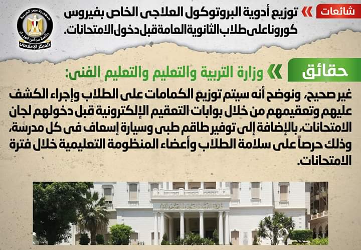 حيث نفت وزارة التربية والتعليم ذلك، وأوضحت أنه سيتم توزيع الكمامات على الطلاب وإجراء الكشف عليهم وتعقيمهم من خلال بوابات التعقيم الإلكترونية قبل دخولهم لجان الامتحانات.