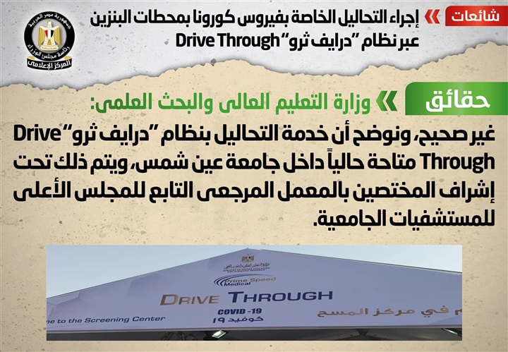 وأكدت وزارة التعليم العالي، أنه لا صحة لإجراء التحاليل الخاصة بفيروس كورونا بمحطات البنزين عبر نظام "درايف ثرو" Drive Through، مُوضحةً أن خدمة التحاليل بنظام "درايف ثرو" Drive Through متاحة حالياً داخل جامعة عين شمس، ويتم ذلك تحت إشراف المختصين بالمعمل المرجعي التابع للمجلس الأعلى للمستشفيات الجامعية.
