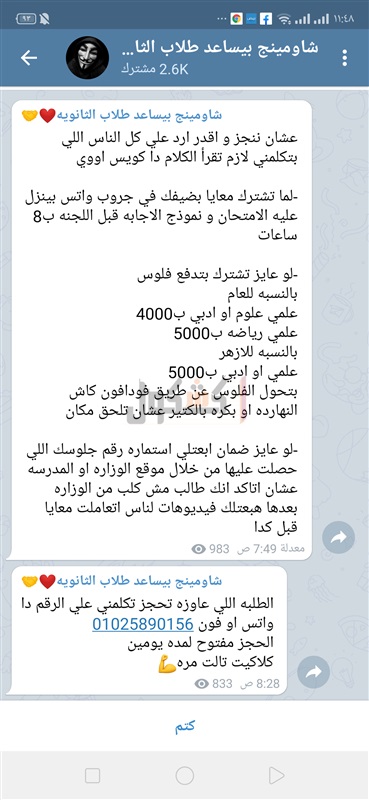في محاولة جديدة لاستغلال طلاب الثانوية العامة وأولياء الأمور، تعود صفحة شاومينج من جديد، عبر التليجرام، تمارس النصب لجمع المال، وادعت الصفحة أنها لديها امتحانات الثانوية العامة قبل بدء الامتحان بـ8 ساعات.
