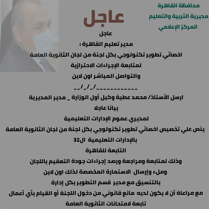 واكدت المديرية في بيانها أن وكيل أول الوزارة مدير مديرية القاهرة أرسل خطابا عاجلا لمديري عموم الإدارات التعليمية، ينص على تخصيص أخصائي تطوير تكنولوجي بكل لجنة من لجان الثانوية العامة بالإدارات التعليمة ال 32 التابعة للقاهرة.