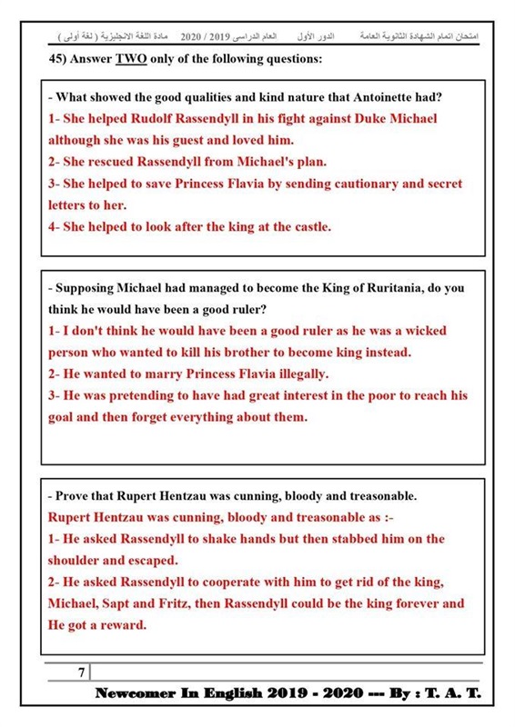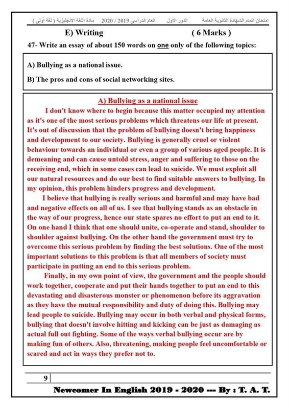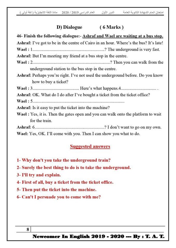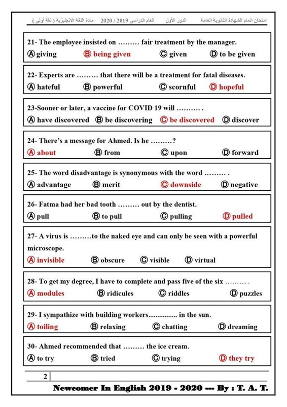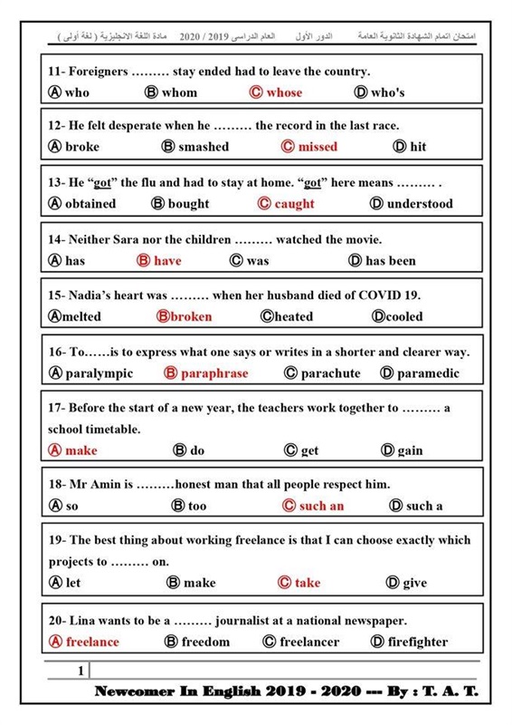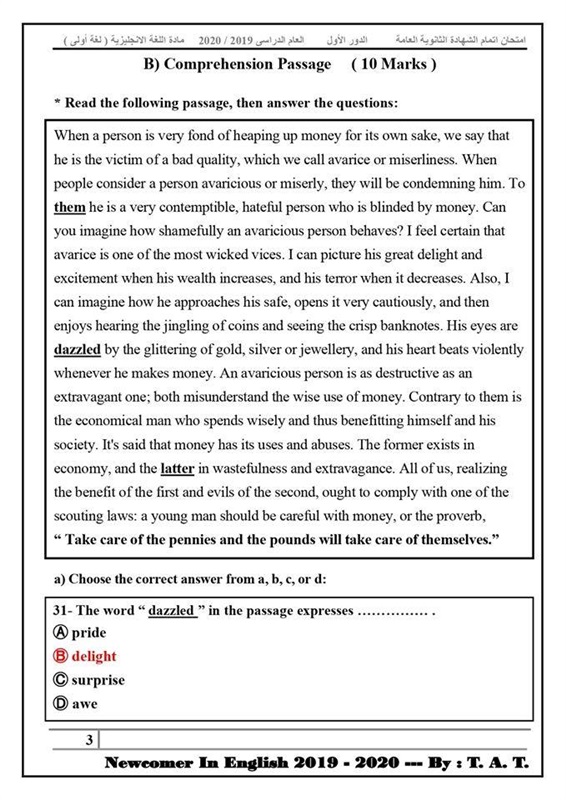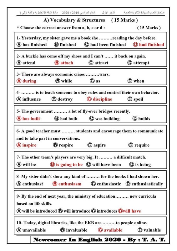 امتحان اللغة الإنجليزية للصف الثالث الثانوي 2020