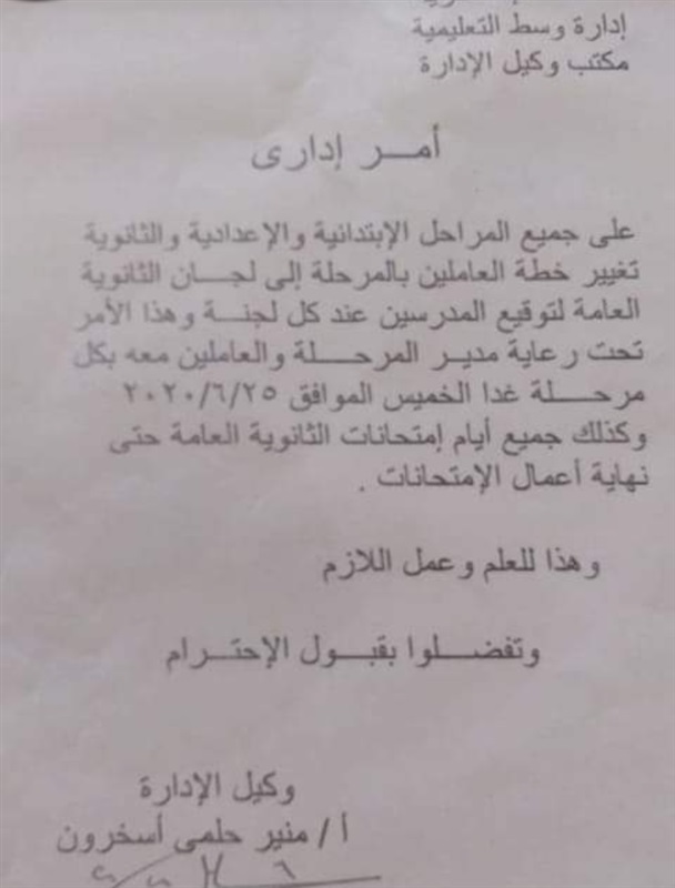 أصدرت مديرية التربية والتعليم في الإسكندرية، أمر إداري يطبق علي جميع المراحل التعليمية"الابتدائية/الإعدادية/الثانوية"، حول تغيير خطة العاملين بالمرحلة إلى لجان الثانوية العامة.