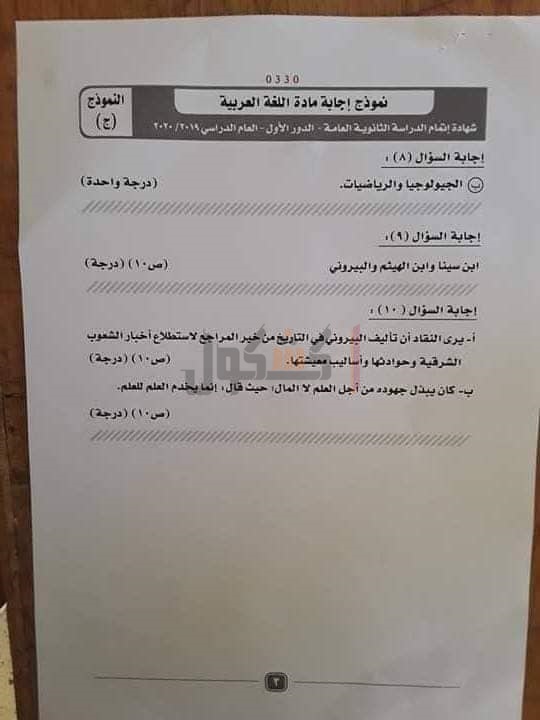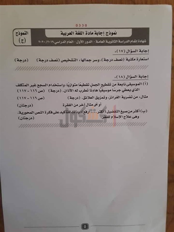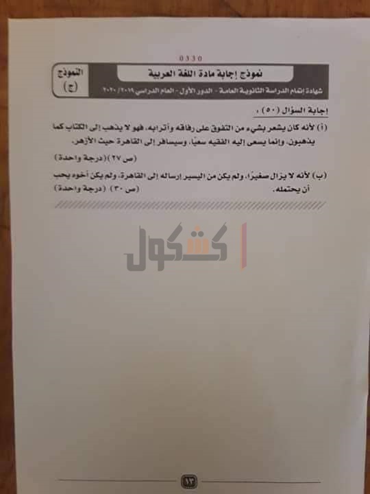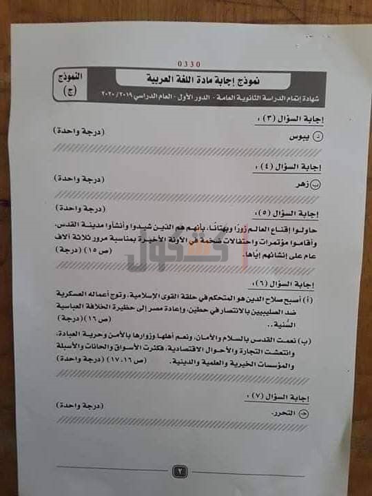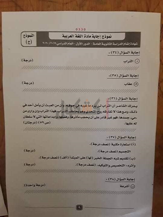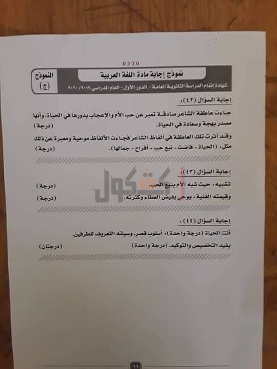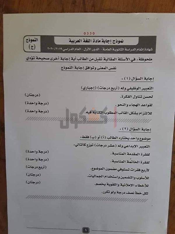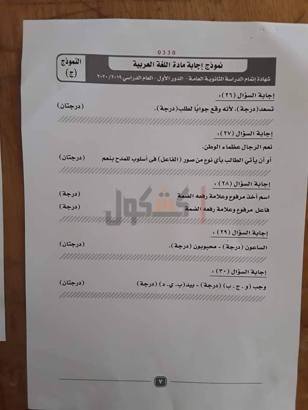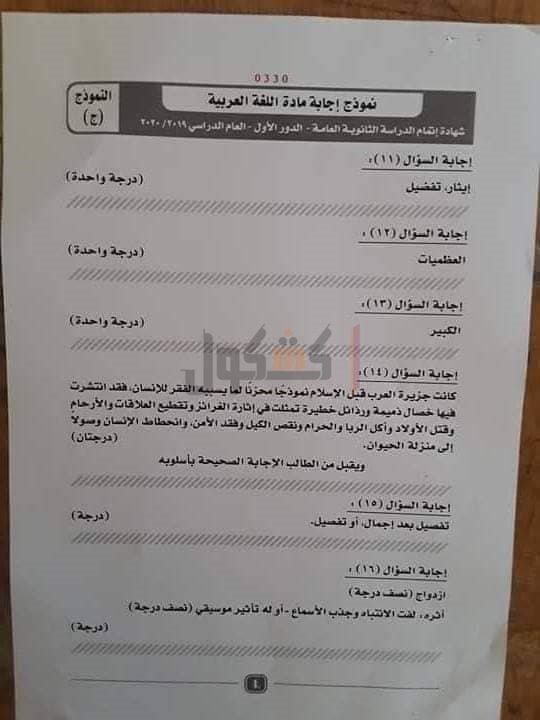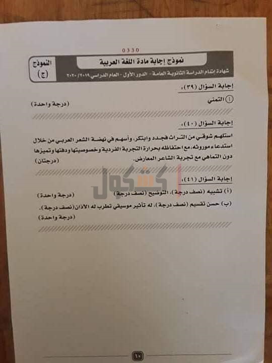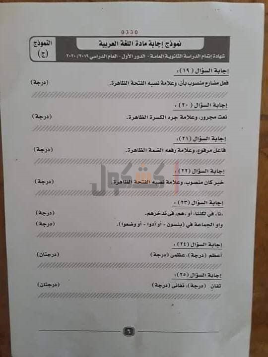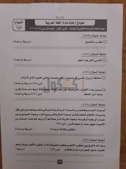 نموذج إجابة امتحان اللغة العربية