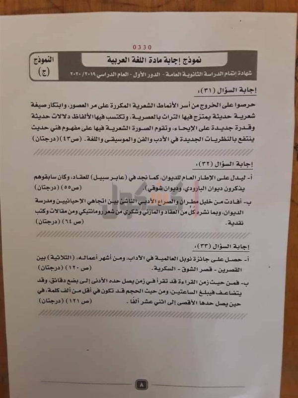 الثانوية العامة 2020.. نموذج إجابة امتحان اللغة العربية "مستند"