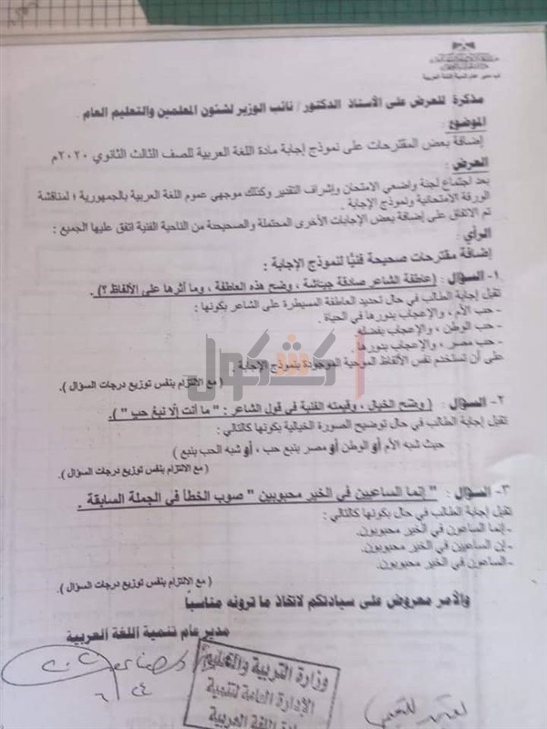 جدير بالذكر أن الدكتور رضا حجازي، رئيس امتحانات الثانوية العامة، اعتمد النموذج النهائي لمادة اللغة العربية الذي أدى الطلاب امتحانه يوم الأحد الماضي.