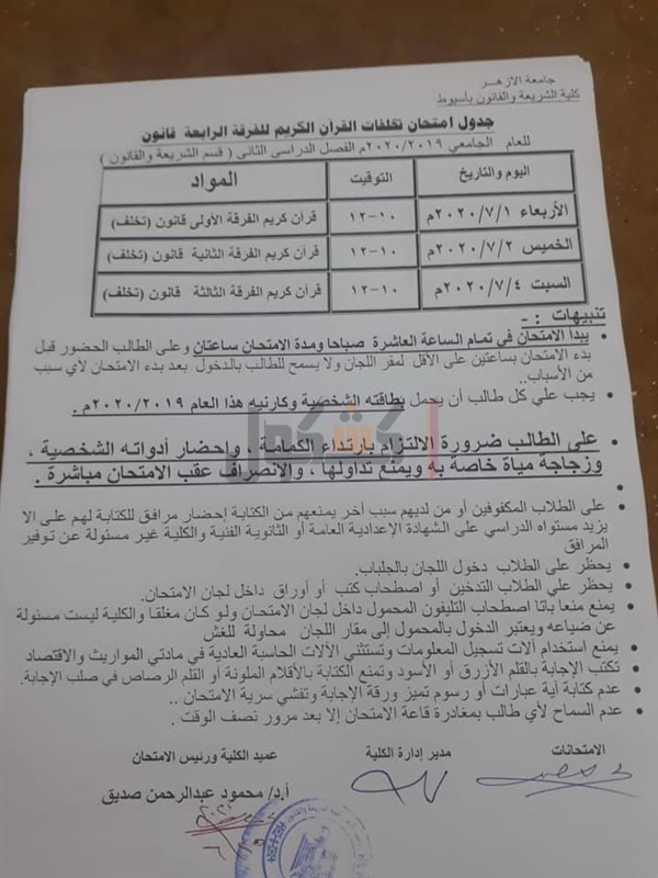 جدول امتحانات الفرقة الرابعة بكلية الشريعة والقانون بأسيوط