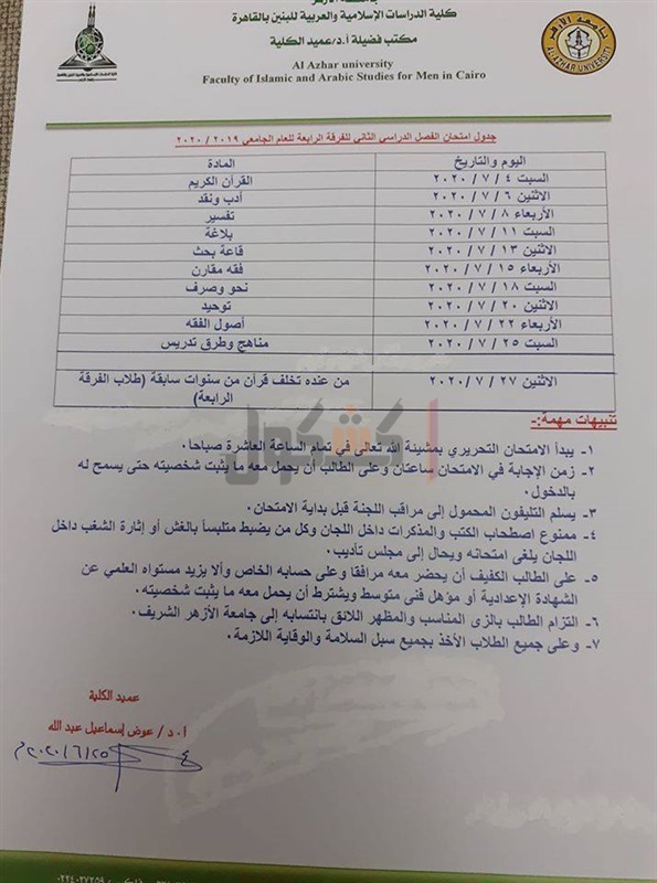جدول امتحان نهاية العام للفرقة الرابعة بدراسات بنين الأزهر بالقاهرة