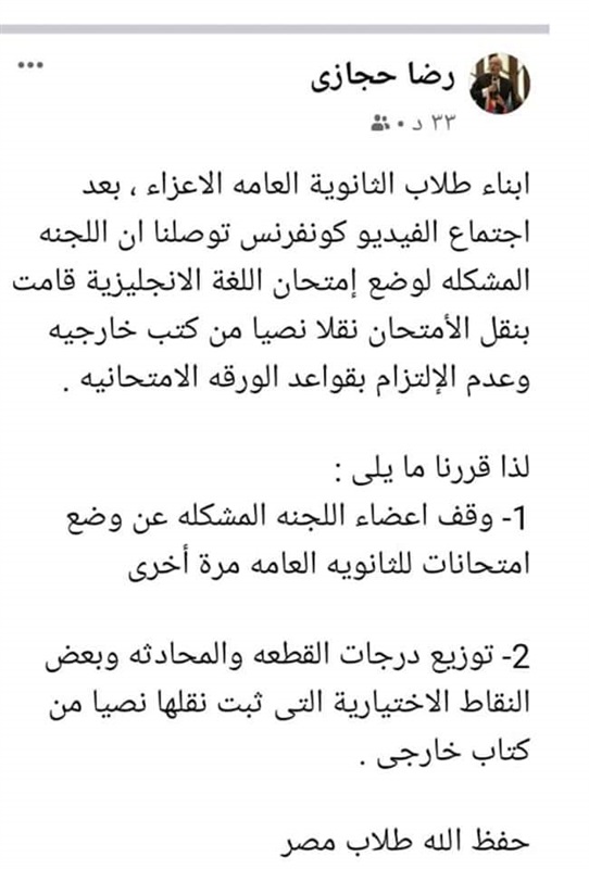 أكد الدكتور رضا حجازي رئيس امتحانات الثانوية العامة أنه تم عمل حساب علي فيس بوك ينشر معلومات مغلوطة ويحمل اسمه.