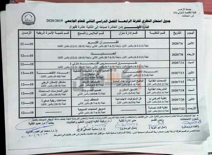 أعلنت كلية الاقتصاد المنزلى بجامعة الأزهر فرع طنطا للطالبات، عن جدول امتحانات الفصل الدراسي الثاني للعام الجامعي 2019-2020م للفرقة الرابعة.