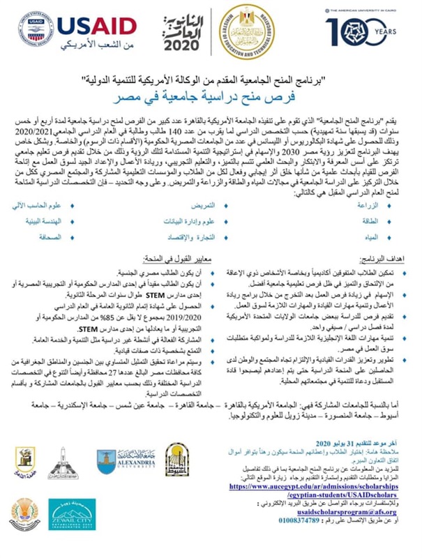 أعلن برنامج المنح الجامعية المقدم من الوكالة الأمريكية للتنمية الدولية تفاصيل فرص المنح الدراسية الجامعية في مصر، الذي ينفذه الجامعة الأمريكية في القاهرة لتقديم عددًا كبيرًا من الفرص لمنح دراسية جامعية لما يقرب من عدد ١٤٠ طالب وطالبة في العام الدراسي الجامعي المقبل 2021/2020.