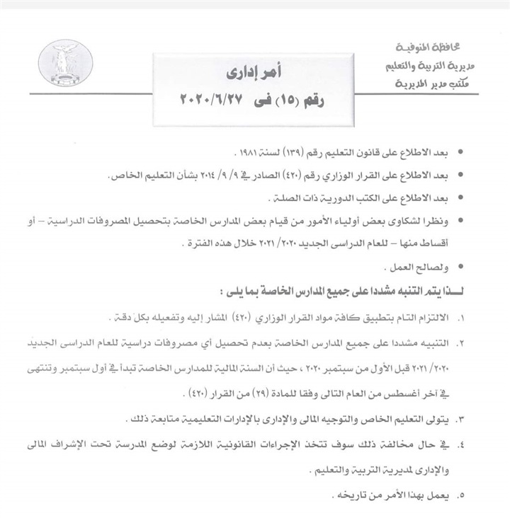 أصدر أحمد سويد مدير مديرية التربية والتعليم والتعليم الفني بالمنوفية، أمرا إداريا بحظر قيام المدارس الخاصة بنطاق المحافظة بتحصيل أية مصروفات دراسية للعام الدراسي الجديد ٢٠٢٠ / ٢٠٢١ قبل الأول من سبتمبر ٢٠٢٠ حيث حدد القرار الوزاري في المادة 29 أن السنة المالية للمدارس الخاصة تبدأ من أول سبتمبر من كل عام وتنتهى فى أخر أغسطس من العام التالى".