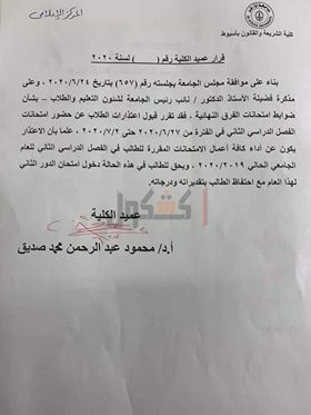 ونص قرار مجلس جامعة الأزهر، الذي حصل كشكول على نسخة منه، على بدء قبول اعتذارات طلاب وطالبات الفرق النهائية عن امتحانات نهاية العام، بدءا من اليوم وحتى الخميس المقبل.