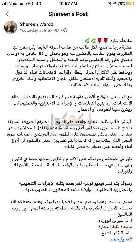 عميد كلية التجارة بجامعة كفر الشيخ، أعلنت أنه سيتم منح 10 درجات هدية لكل طالب من