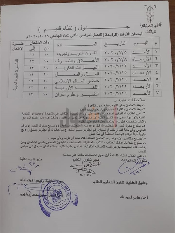 أعلنت كلية الدعوة الإسلامية بجامعة الأزهر فرع البنين بمدينة نصر، عن جدول امتحانات الفصل الدراسي الثاني للعام الجامعي 2019-2020م للفرقة الرابعة.