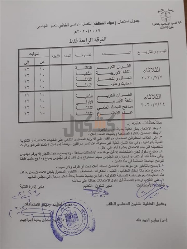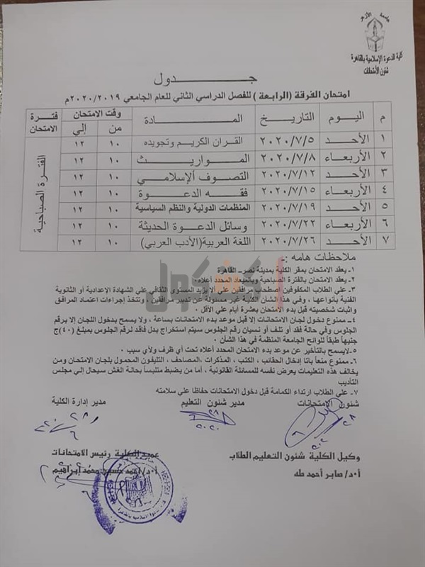 جدول امتحانات الدعوة الإسلامية للفرقة النهائية 2020