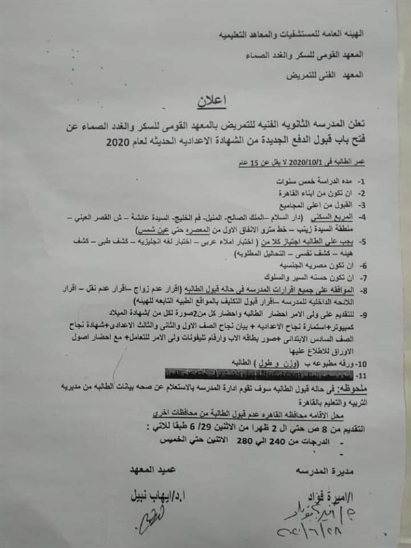 أعلنت المدرسة الثانوية الفنية للتمريض بالمعهد القومي للسكر والغدد الصماء، عن فتح باب قبول الدفع الجديدة من حملة الشهادة الإعدادية للعام 2020.