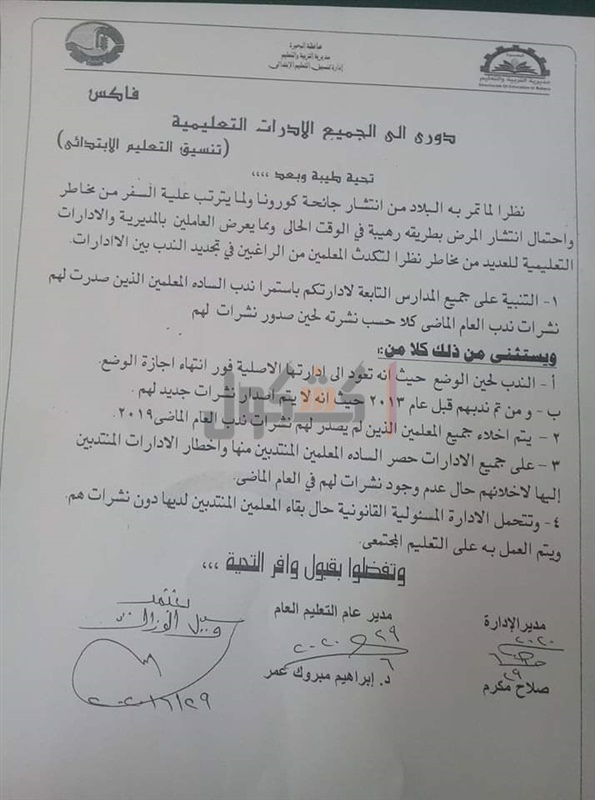 وشددت على ضرورة التنبيه على جميع المدارس باستمرار ندب المعلمين الذين صدرت لهم نشرات ندب العام الماضي كلا حسب نشرته لحين صدور نشرات لهم.