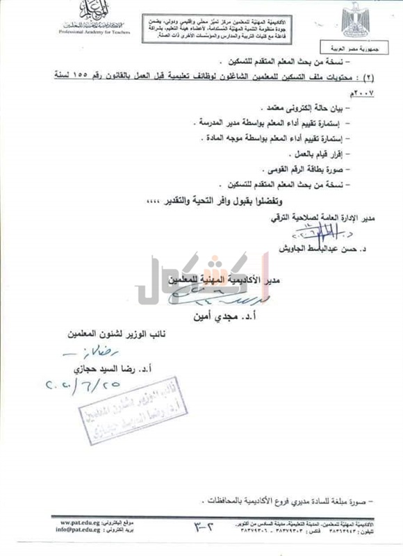 حددت الأكاديمية المهنية للمعلمين، محتويات ملف التسكين على وظائف تعليمية وفق القانون 155 لسنة 2007.
