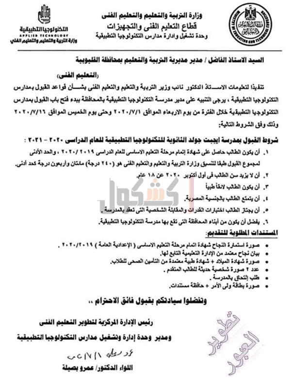 أعلنت وزارة التربية والتعليم والتعليم الفني، تنسيق القبول بمدرسة ايجيبت جولد الثانوية للتكنولوجيا التطبيقية للعام الدراسي 2020/2021.
