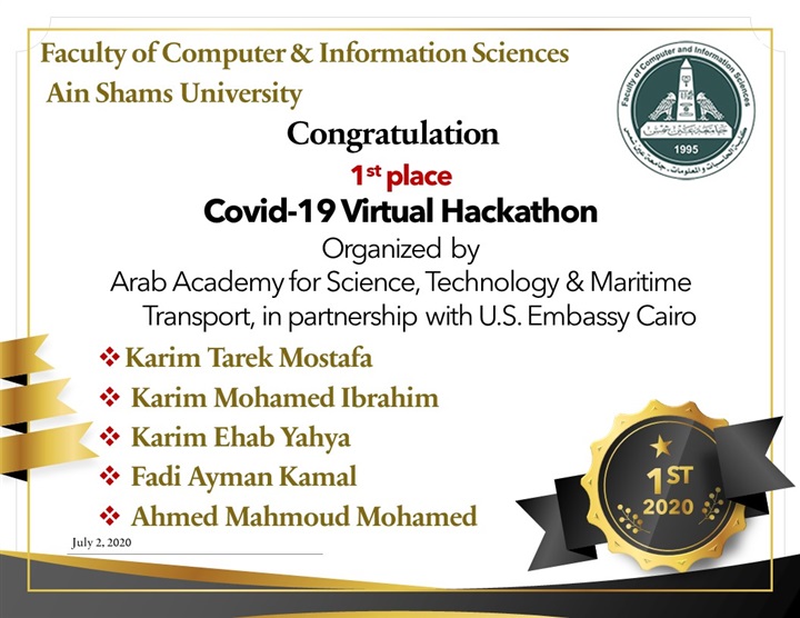 كريم طارق مصطفي ، كريم محمد ابراهيم ، كريم ايهاب يحي، فادي ايمن كمال ، احمد محمود محمد، علي المركز الاول بالهاكاثون الإفتراضي لـ كوفيد-١٩.