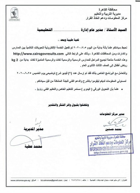 تفعيل خدمة التحويل الإلكتروني بين الإدارات والمدارس بالقاهرة