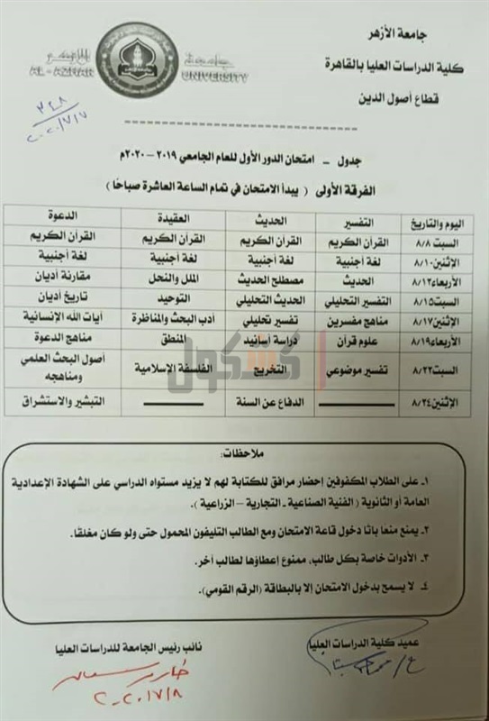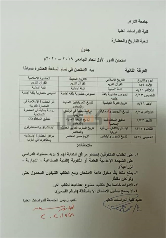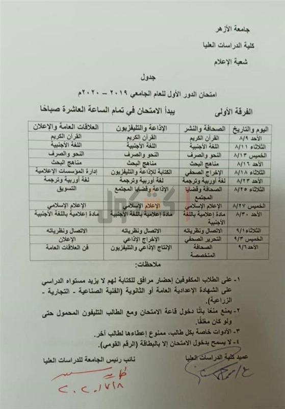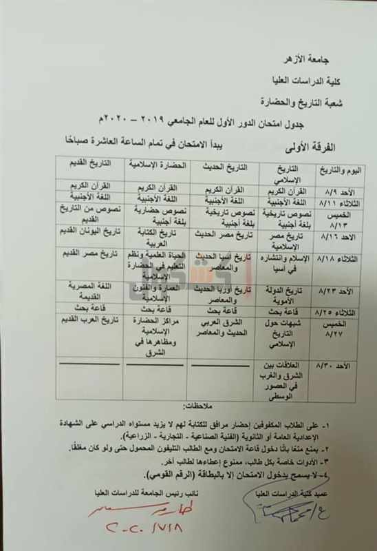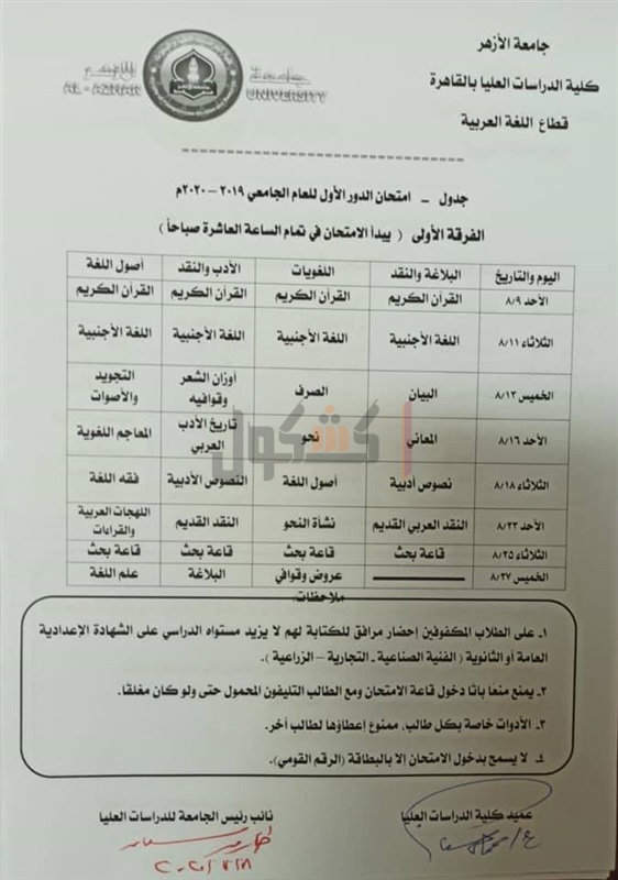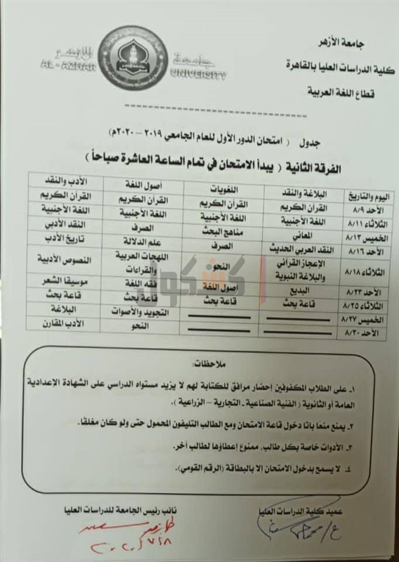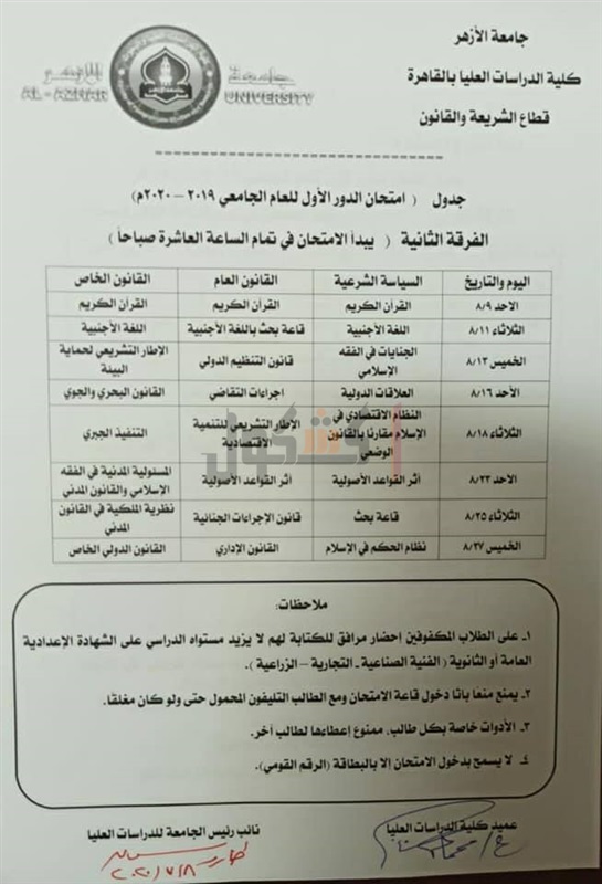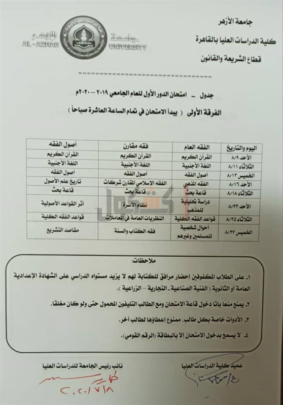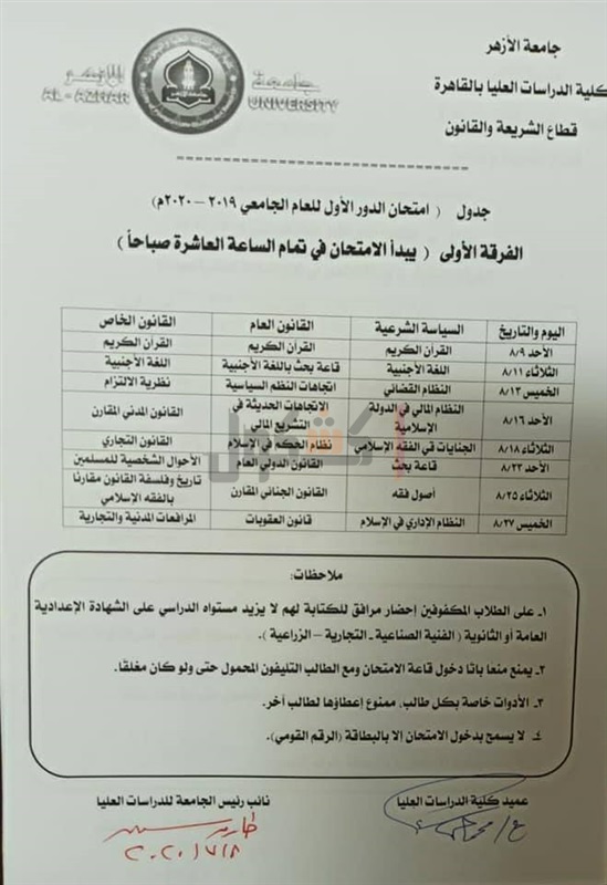 وجاءت جداول امتحانات الدور الأول، لطلاب الدراسات العليا بالأزهر، كما يلي: