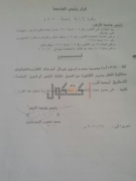 ولفتت إلى أن لجنة التحقيقات التي يرأسها الدكتور حامد ابوطالب عميد كلية الشريعة والقانون الأسبق، أوصت بإيقاف أستاذ الطب، عن العمل ثلاثة أشهر، وإحالته للتحقيق، وهو ما استجاب له الدكتور محمد المحرصاوي رئيس الجامعة.