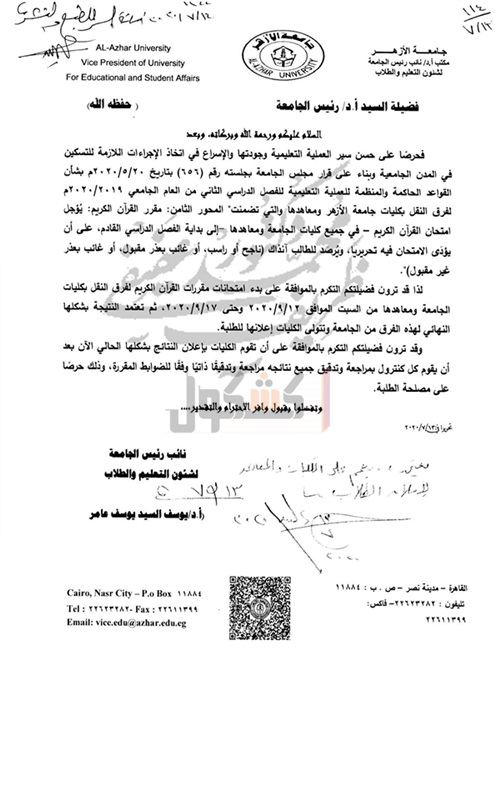 الأزهر الغت الامتحانات لكل فرق النقل فى العام الحالى واستبدالها بالأبحاث