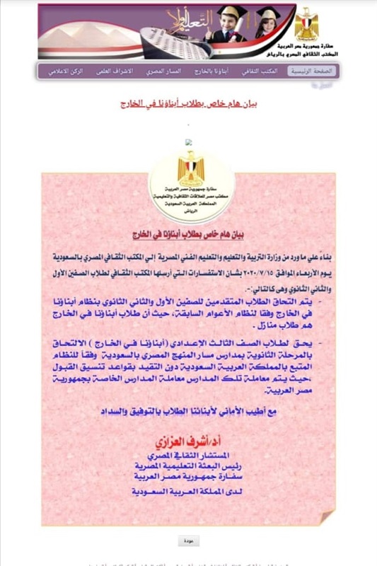 أصدرت وزارة التربية والتعليم والتعليم الفني، بيانا ردا على استفسارات أولياء أمور أبناؤنا بالخارج التي تم إرسالها للمكتب الثقافي بشأن طلاب الصفين الأول والثاني الثانوي وهي كما يلي: