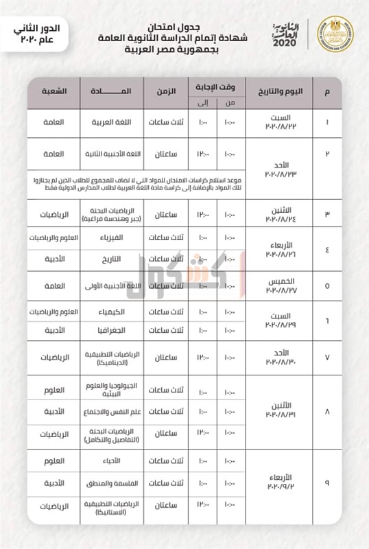 أعلنت وزارة التربية والتعليم والتعليم الفني جدول امتحانات "الدور الثاني" لشهادة إتمام الدراسة الثانوية العامة للعام الدراسي ٢٠١٩- ٢٠٢٠ والتي ستبدأ يوم ٢٢ / ٨ / ٢٠٢٠ وتنتهي 3 سبتمبر.